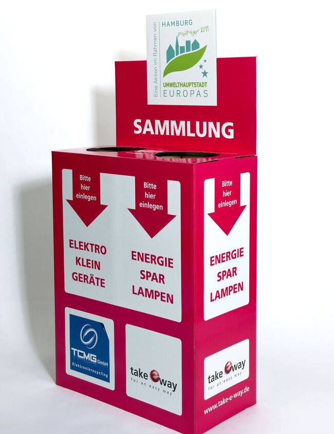 take-e-way startet verbrauchernahe Sammlung von Energiesparlampen und Haushaltskleingeräten in Hamburg, Europas Umwelthauptstadt 2011 und gewinnt 150 neue Sammelstellen (5 Jahre vor der Einführung der Rücknahmepflicht von Altgeräten im Handel); Elektro-Sammelbox von take-e-way mit SIGNAL IDUNA-Umweltpreis ausgezeichnet
