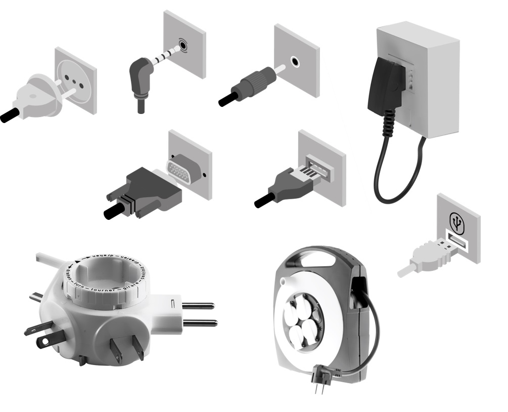 - Adapter, Klinke, Stecker: Adapter (z. B. Displayport zu HDMI, DVI-HDMI, USB auf Micro-USB), Klinkenadapter (z. B. 6,35 mm auf 3,5 mm), Niedervoltkoppler, Reisestecker, Telefonverteiler, Telefonadapter, Zwischenstecker